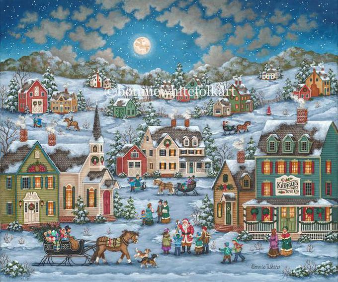 Christmas is just around the corner and this town is bustling with last minute shoppers. Just above on the left, a farmer brings his horses in for the night while in the field to the right, children get in a few more runs with their sleds before dinner. As the pastor of the little white church waves at a family traveling by, down below, there's commotion as a gentleman dressed in red with a sled full of toys passes through.